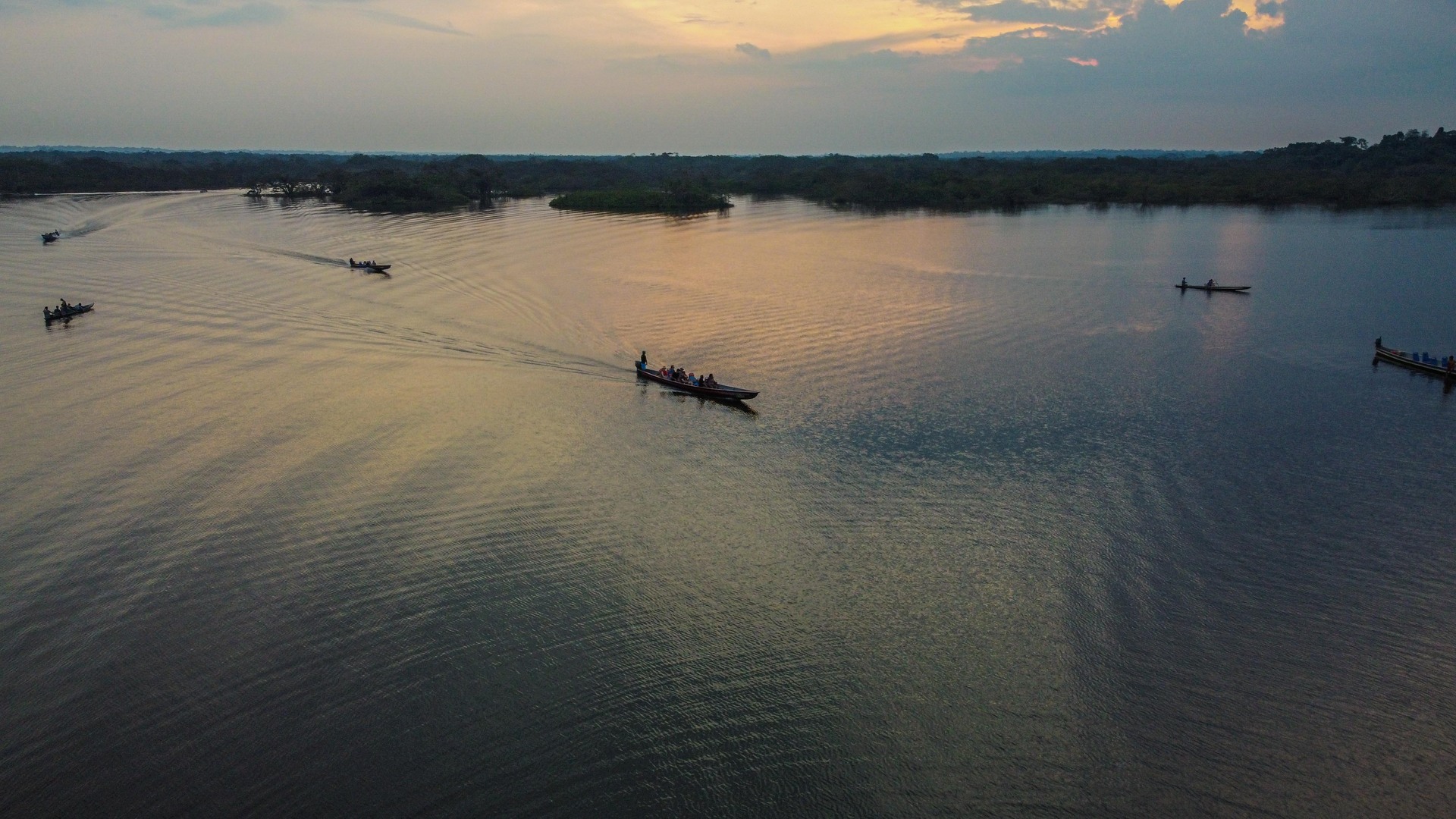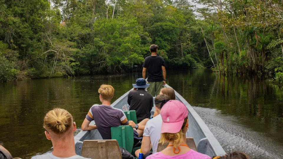 Départ de Lago Agrio vers 9h30 jusqu’à « El Puente » en navette (2 heures de trajet environ). Déjeuner. Transport jusqu’au lodge en pirogue à moteur, l’occasion de commencer la découverte de la biodiversité du Cuyabeno. Installation dans vos chambres. Après-midi de détente avec une première balade en bateau jusqu'à la laguna grande. Dîner et nuit au lodge. -