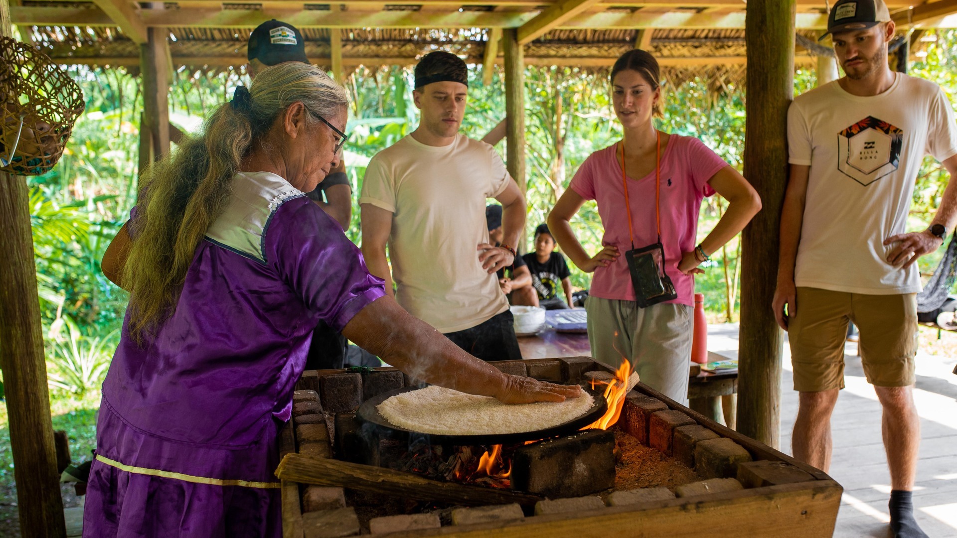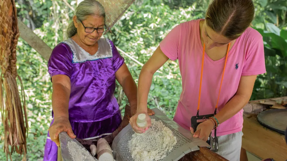 Petit déjeuner. Vous vous rendrez ensuite dans une communauté Siona après 30 minutes de pirogue et une marche à travers la forêt et les plantations d'environ 1 heure. Vous serez accueillis par une femme du village pour apprendre à confectionner une denrée de base en Amazonie : la galette de Manioc (appelée Casabe). Déjeuner sur place. Navigation et baignade dans la lagune. Dîner et nuit au lodge. -
